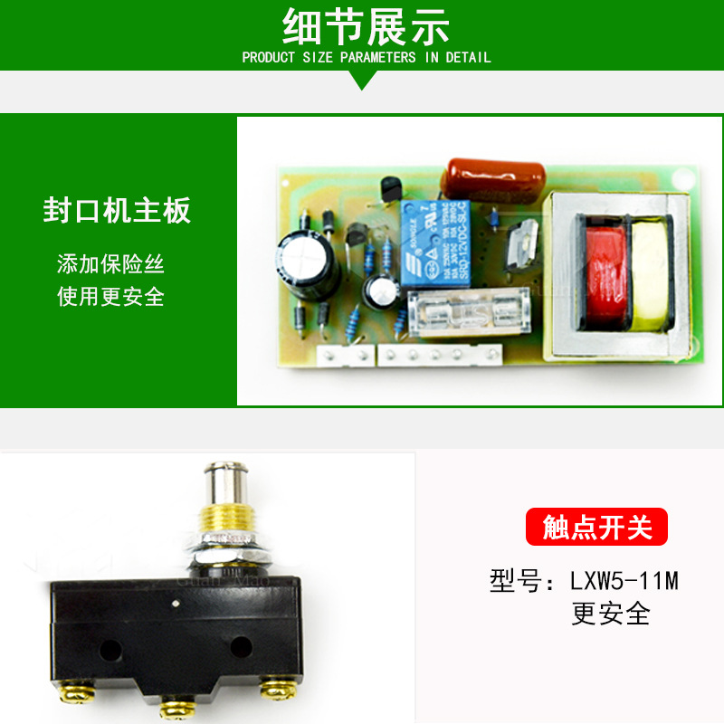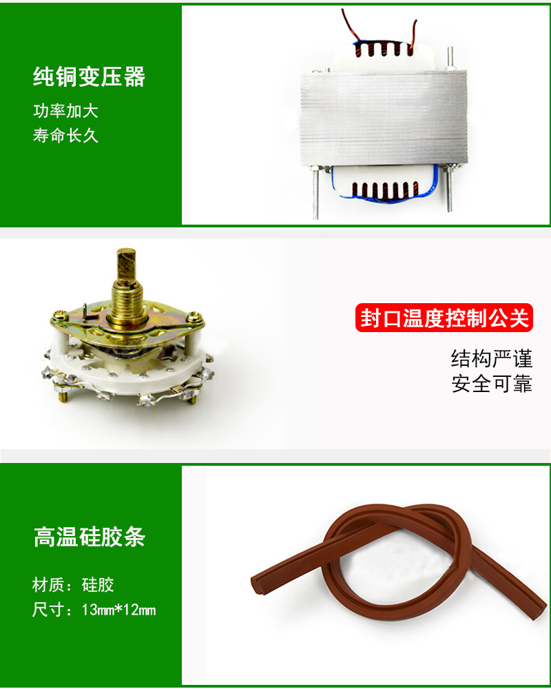 - 封口部件:主要包括封口模具,其形狀和材質(zhì)會因封口類型和包裝材料的不同而有所差異。對于普通的塑料薄膜封口,模具通常是平面的,材質(zhì)多為耐高溫的金屬,如不銹鋼。這樣的設(shè)計可以保證在加熱和壓力作用下,使包裝材料很好地融合在一起。