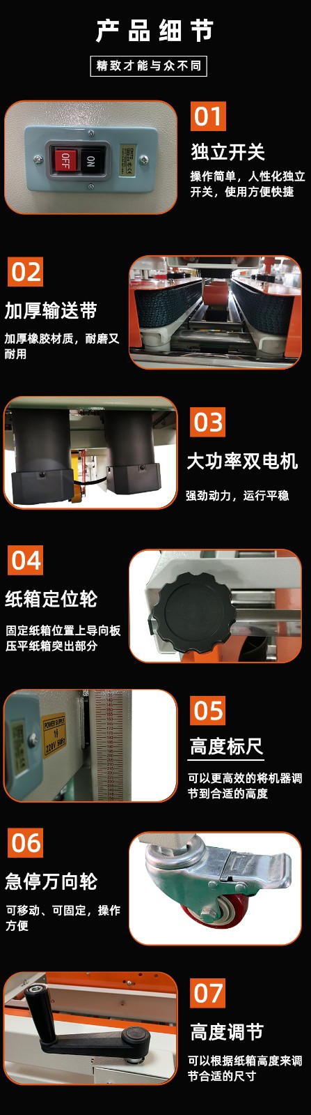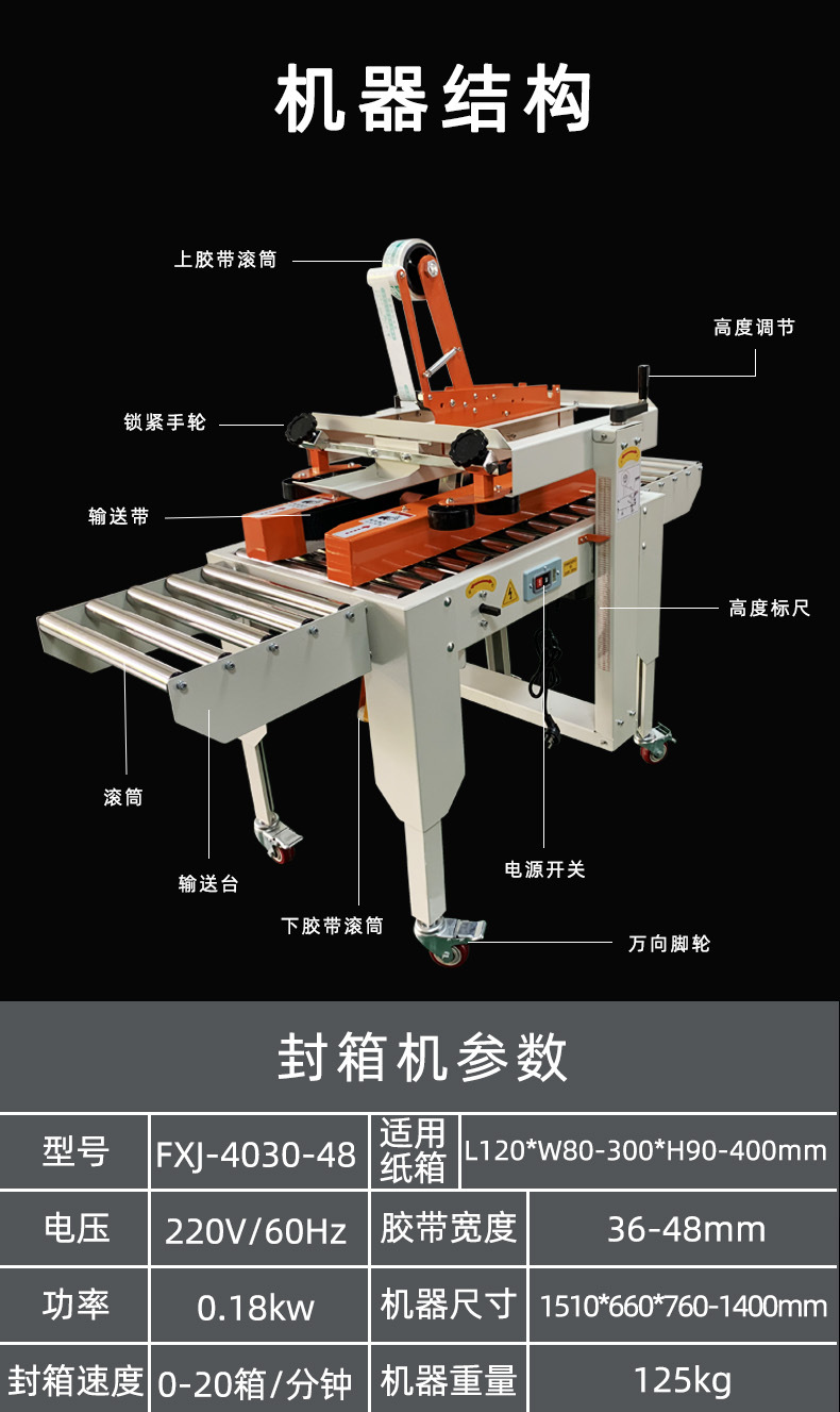 • 紙箱尺寸調整:當紙箱尺寸發生變化時,需要調整輸送帶的寬度和高度。一些封箱機的輸送帶是可以通過手動調節支架的位置來改變寬度的,以適應不同寬度的紙箱。對于高度的調整,可以通過調節封箱頭的高度來確保膠帶能夠準確地粘貼在不同高度的紙箱封口上。