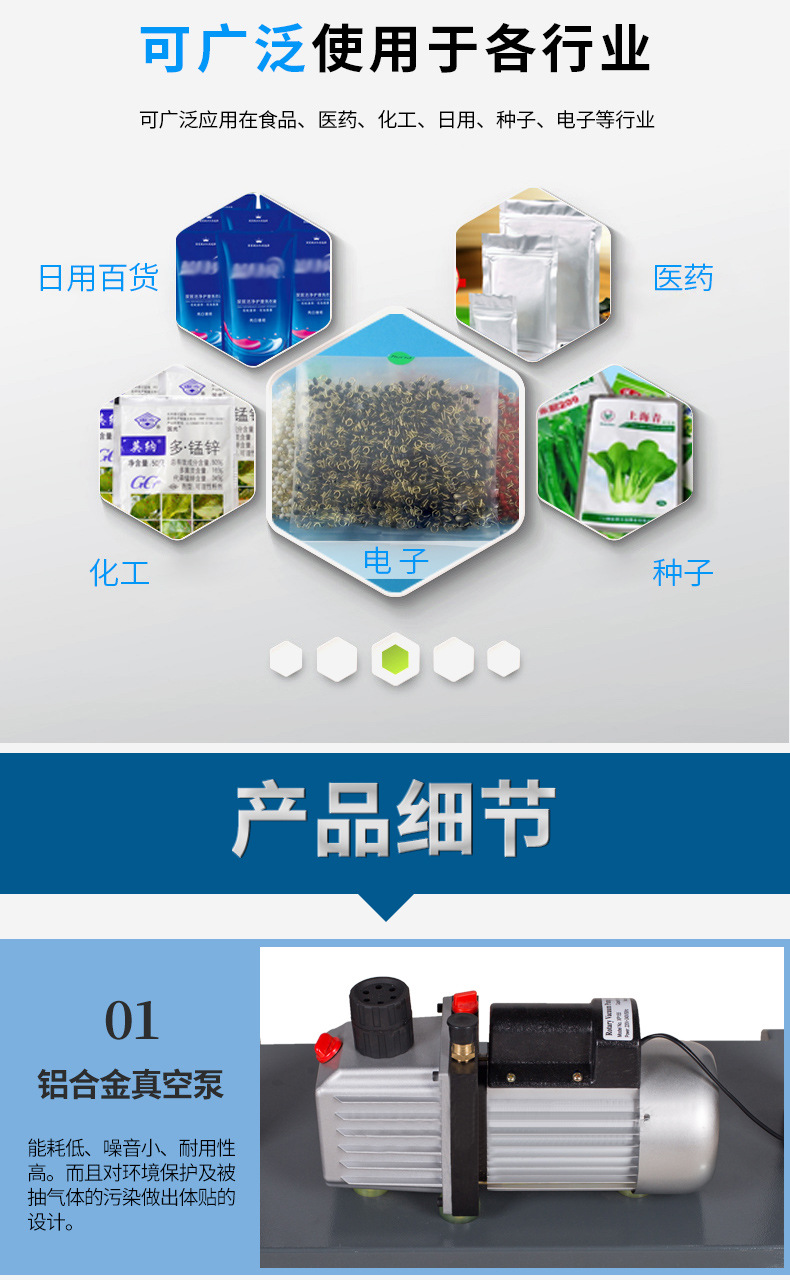 - 化工建材行業(yè):化工原料、涂料、膠水、建材等產(chǎn)品的包裝,通過抽真空可防止產(chǎn)品受潮、變質(zhì)、揮發(fā)等,同時(shí)也便于儲(chǔ)存和運(yùn)輸.