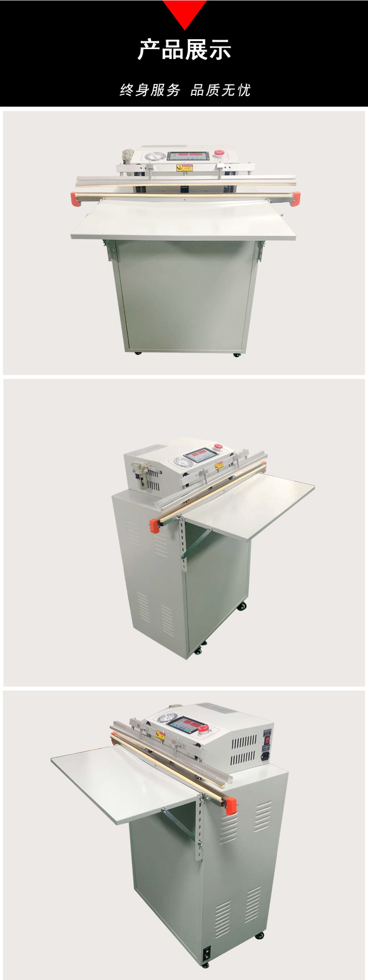 真空包裝機主要由真空泵、真空表、真空電磁閥、抽氣嘴、封口系統、控制系統、不銹鋼工作臺等部件組成