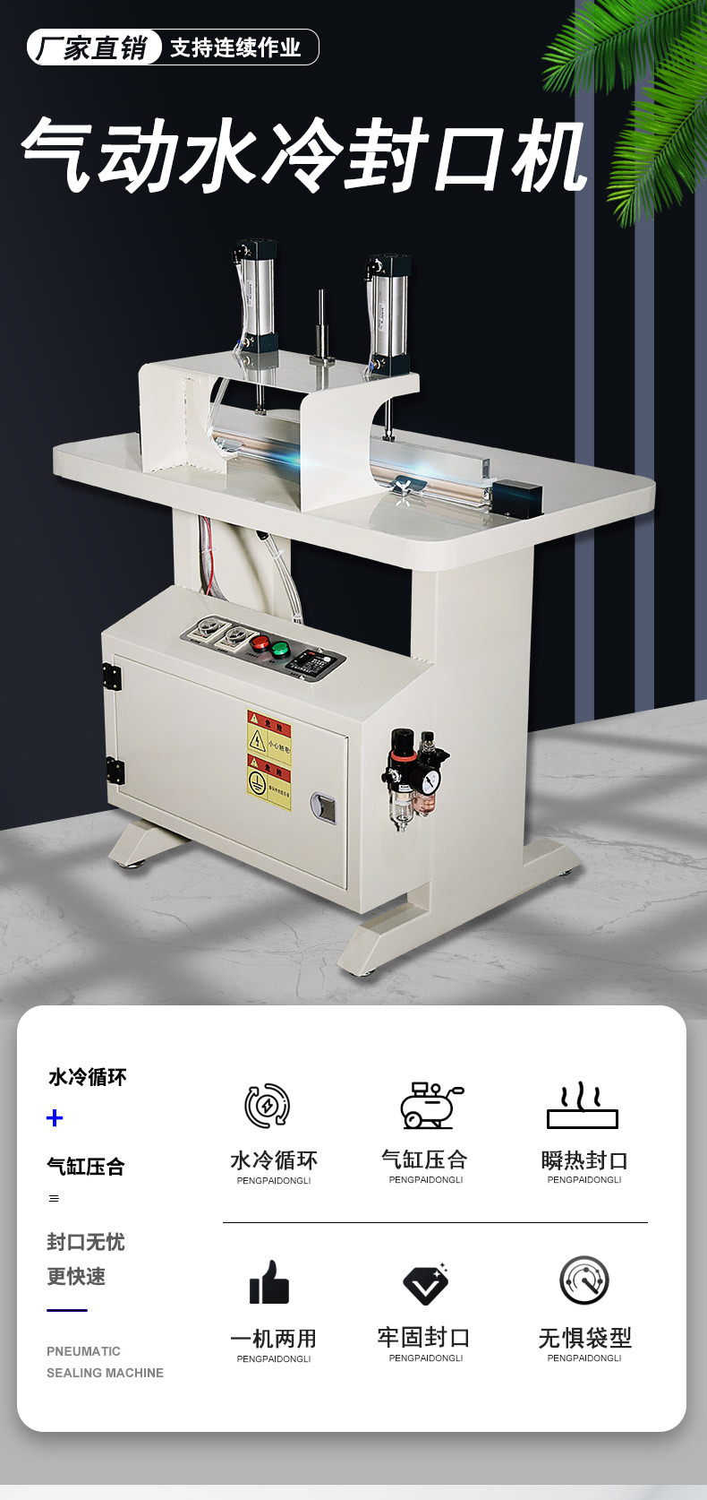 - 啟動封口:踩下腳踏開關(guān)或按下操作面板上的封口按鈕,封口壓頭在氣缸(或其他動力裝置)推動下下壓,包裝袋與加熱的封口條緊密貼合,封口處塑料受熱熔融;與此同時,水冷系統(tǒng)同步運(yùn)行,帶走熱量促使封口快速冷卻定型。
