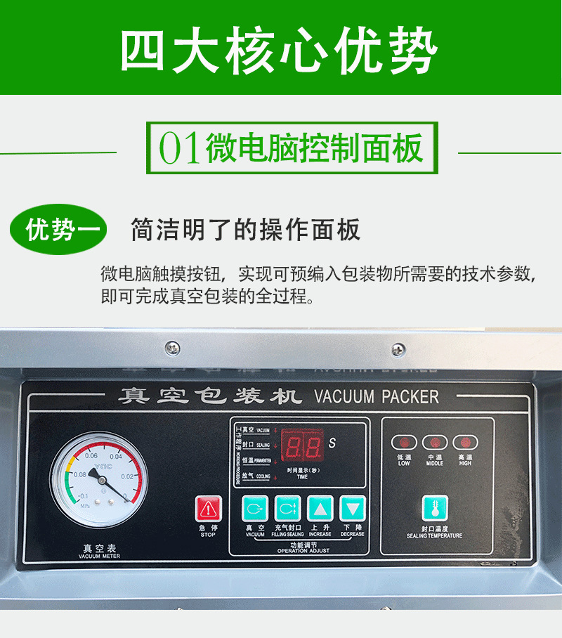 • 操作簡便:設備的控制面板設計簡潔直觀,各項參數調節一目了然,操作人員無需復雜培訓,即可快速上手,輕松完成真空包裝任務。