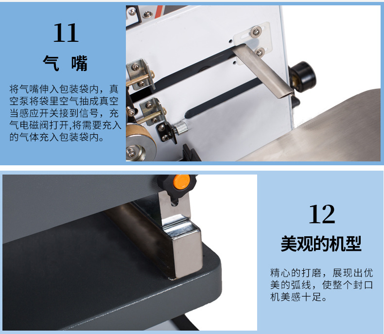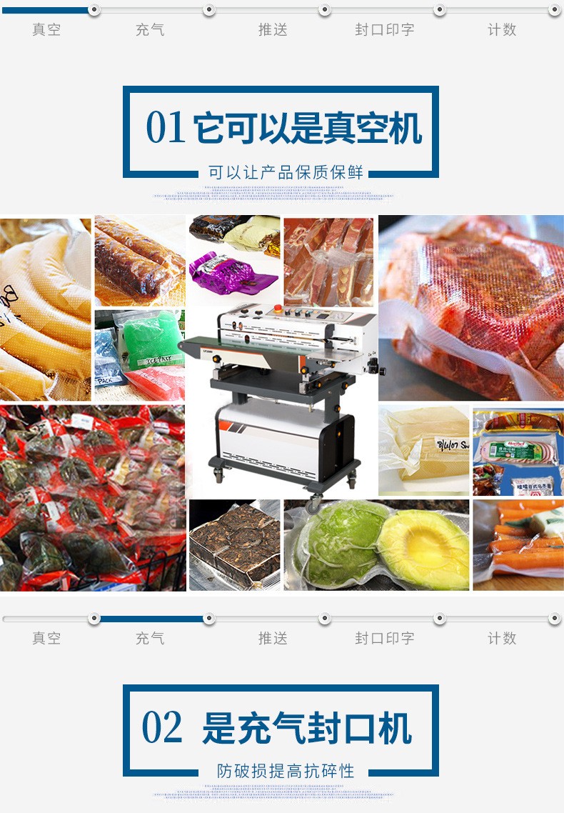 連續(xù)式抽真空包裝機整個流程一氣呵成,借助輸送帶的勻速、持續(xù)運轉(zhuǎn),實現(xiàn)產(chǎn)品不間斷地包裝