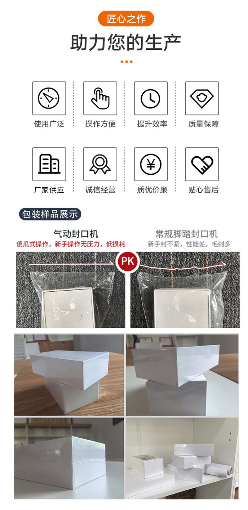 - 腳踏封口機:主要通過腳踏板控制封口動作,操作相對簡單直接,但自動化程度較低。一般需要人工手動控制封口時間和溫度等參數,且不太容易與其他設備集成實現自動化生產,更適用于小型企業或家庭作坊等小規模包裝作業。