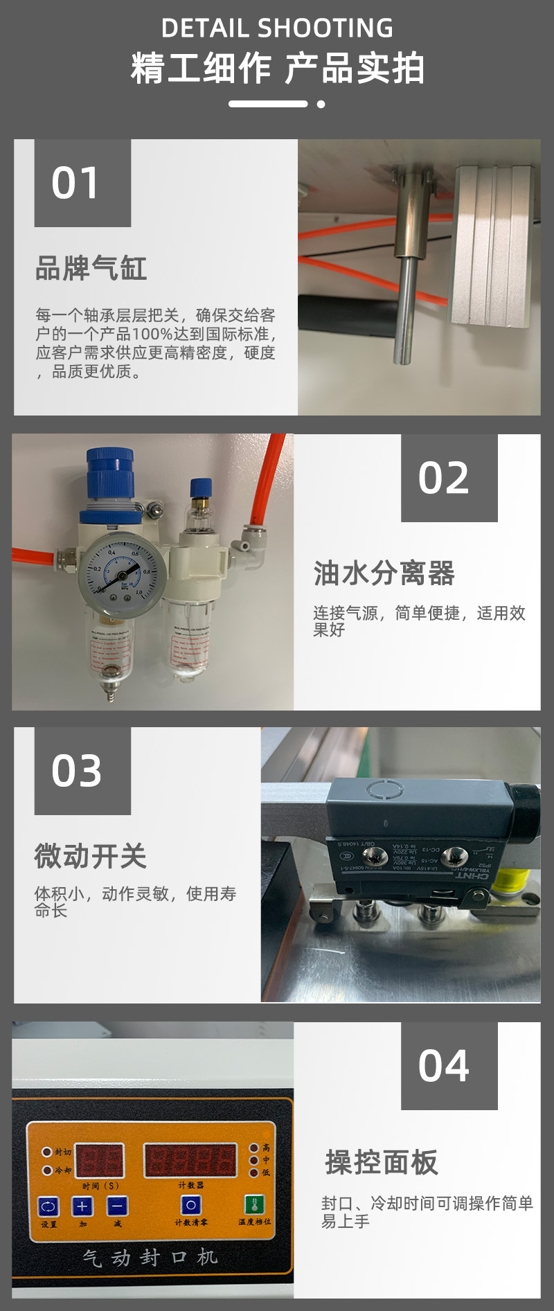 - 氣動封口機:依靠壓縮空氣作為動力源。通過氣動系統將壓縮空氣轉化為機械能,驅動封口部件進行封口操作。這種動力方式能夠提供較大且穩定的壓力,適用于各種材質和厚度的包裝材料封口。