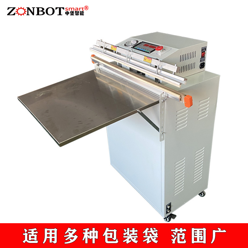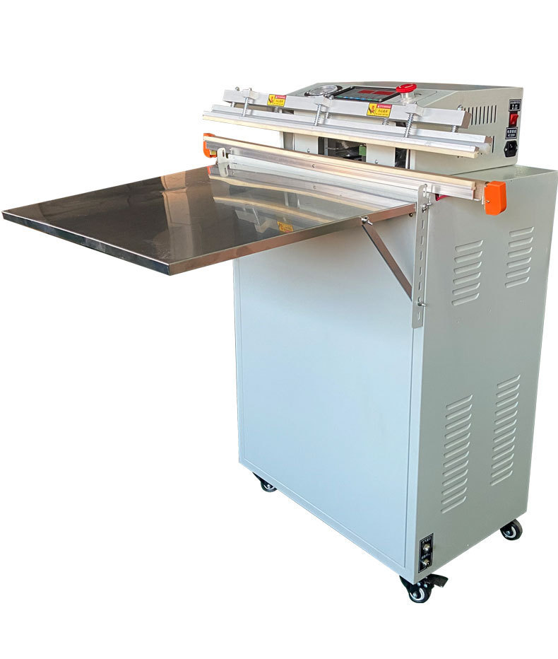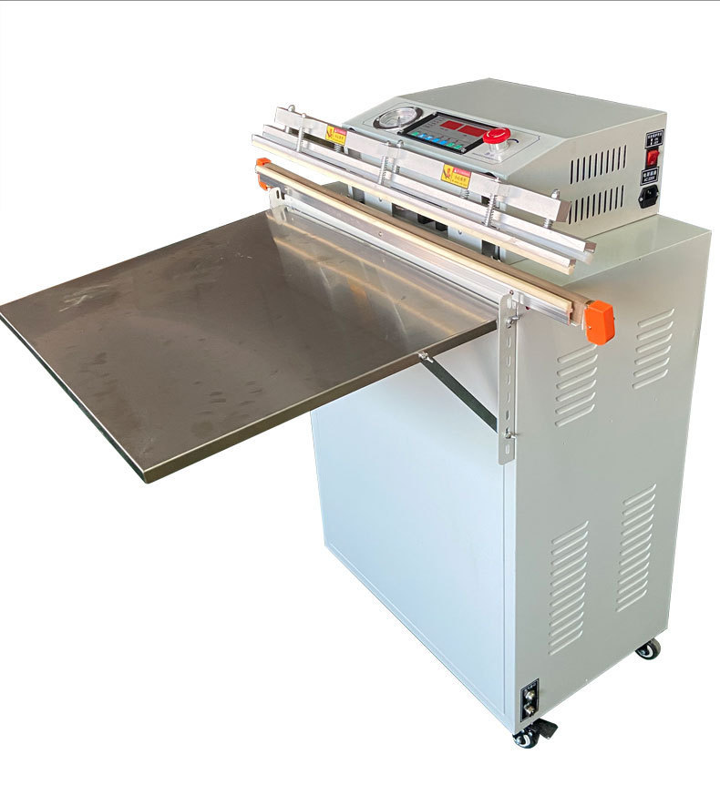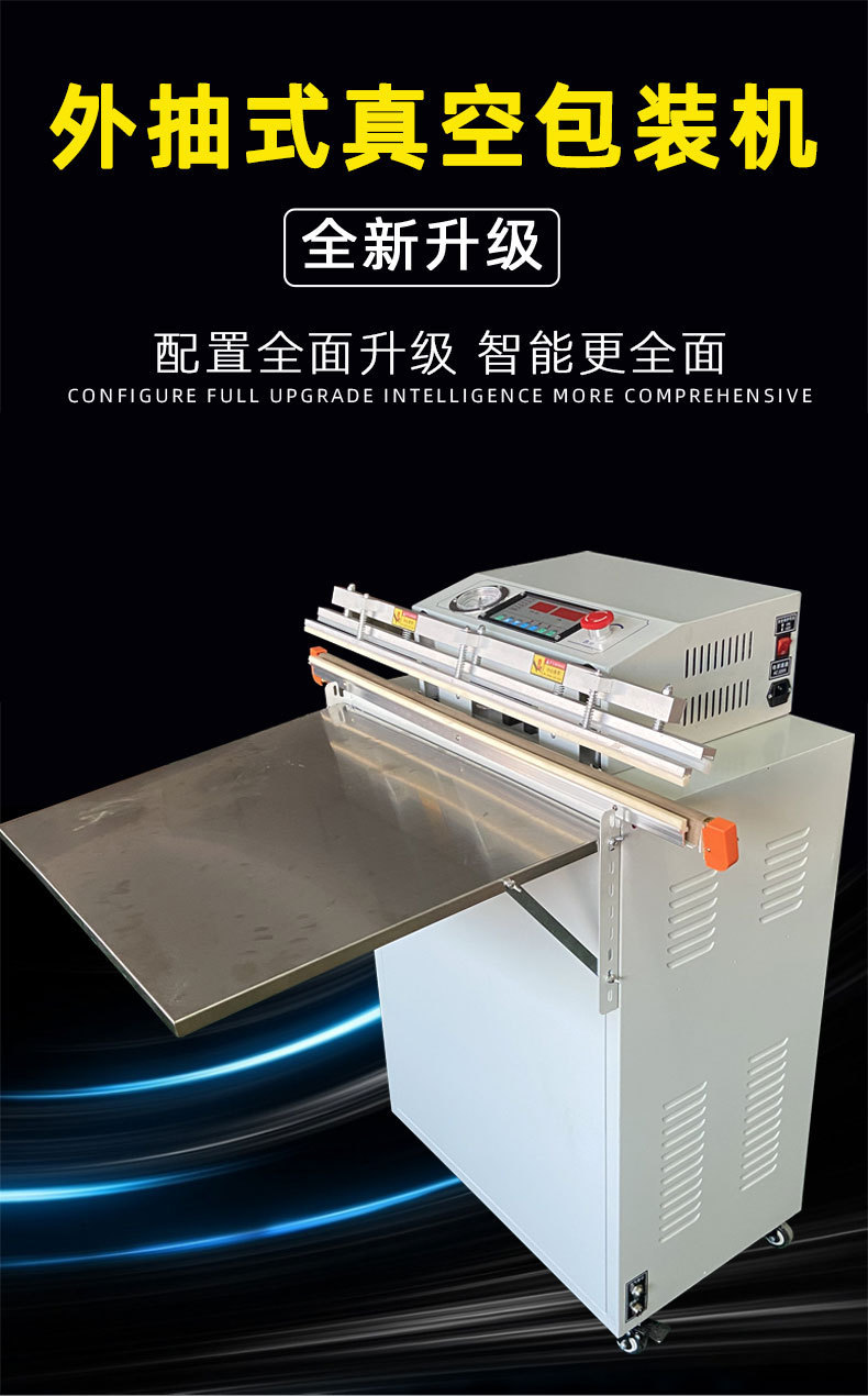 - 外抽式真空包裝機:把包裝袋放在真空室外的工作臺上,通過抽氣嘴伸入包裝袋內抽氣,同時利用熱封裝置對包裝袋進行封口,無需將產品放入真空室。
