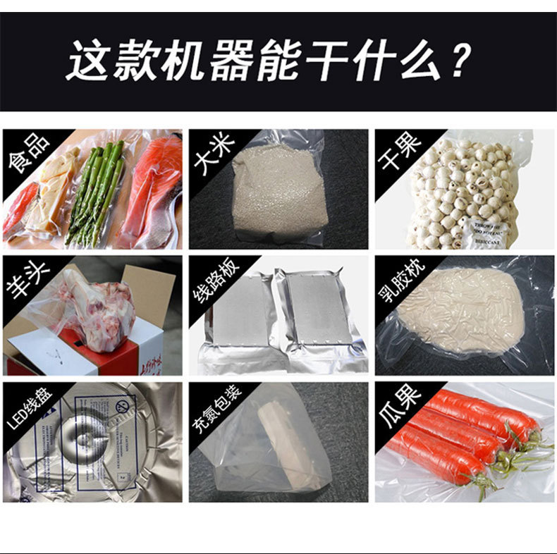 - 內抽式真空包裝機:適用于各種形狀、尺寸和質地的產品,尤其是對包裝密封性要求較高、需要完全隔絕空氣的產品,如食品、電子元件、藥品等。