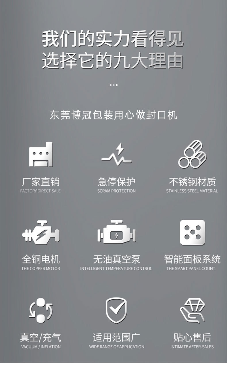 - 內抽式真空包裝機:將產品放入真空室內,關閉真空室門后,真空泵抽出真空室內的空氣,使包裝容器內達到預定的真空度,然后進行熱封合,完成包裝過程。
