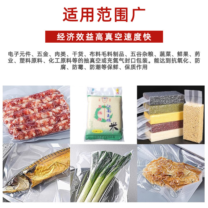 - 食品行業(yè):用于包裝各種食品,如肉類、海鮮、干貨、休閑食品等。例如,在肉類加工廠,可以用它來(lái)真空包裝新鮮的肉塊,延長(zhǎng)保質(zhì)期;在干貨生產(chǎn)廠,包裝木耳、香菇等干貨,防止受潮和蟲(chóng)害。