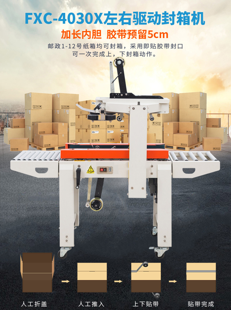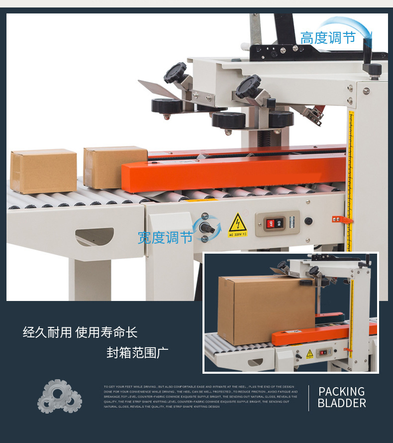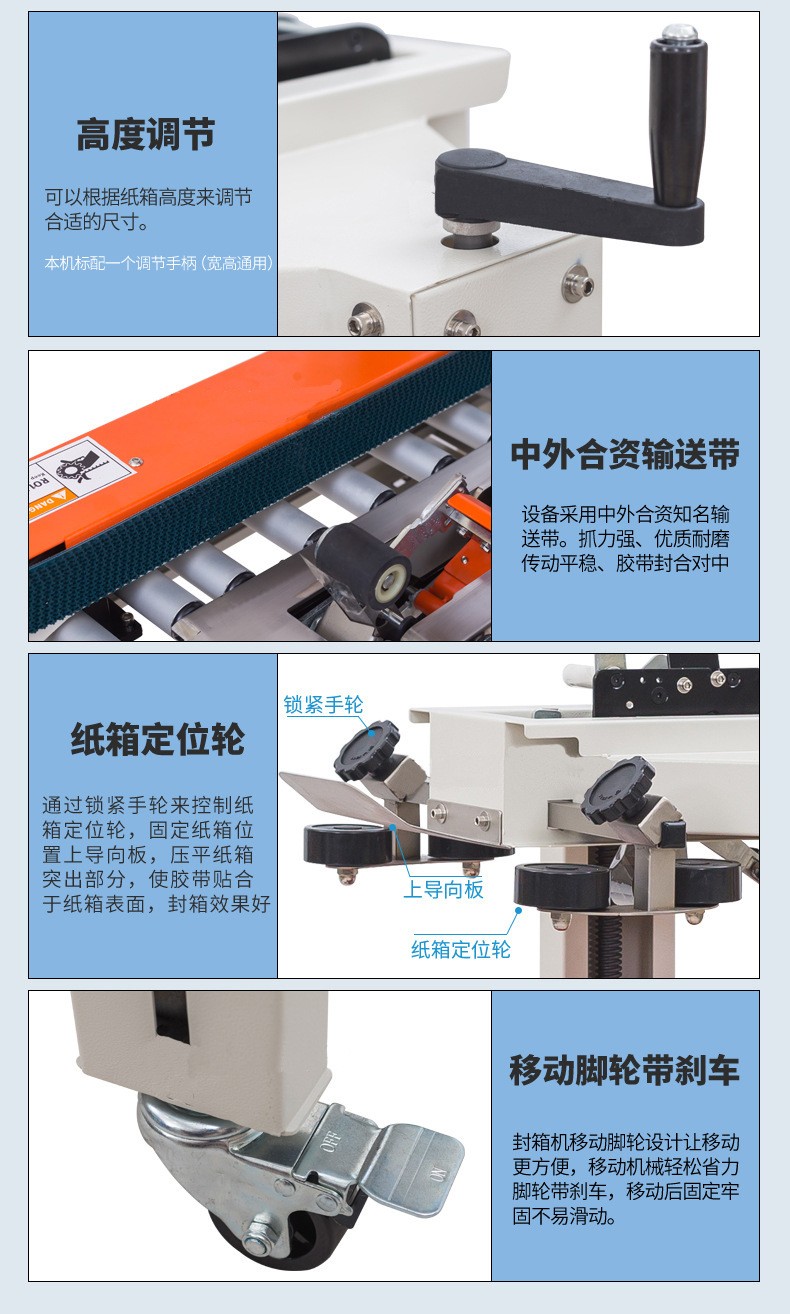 • 有膠帶支架、膠帶切割裝置和膠帶粘貼裝置等部分。膠帶支架用于放置膠帶卷,膠帶切割裝置能夠準確地將膠帶切斷,避免膠帶過長或過短影響封箱效果。膠帶粘貼裝置則通過壓力滾輪等結構將膠帶粘貼在紙箱上,并且可以調整粘貼的壓力,適應不同厚度的紙箱。