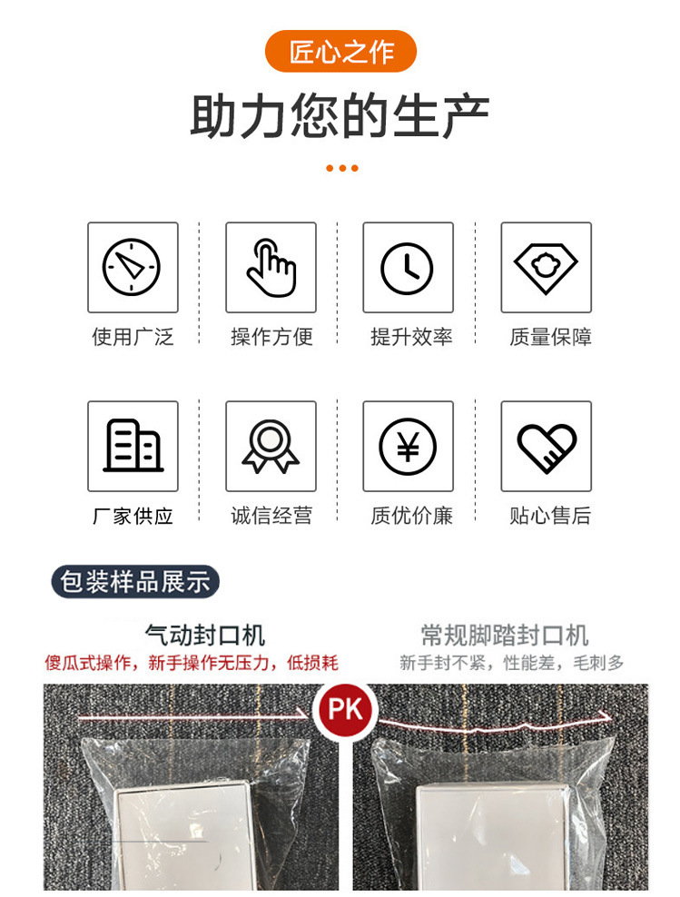 - 安全節能:一些腳踏封口機設有抽吸裝置,可處理加熱產生的煙氣,減少廢氣排放;工作完成后,將熱封溫度旋鈕逆時針旋轉最低打開封機開關拔掉插頭即可 。