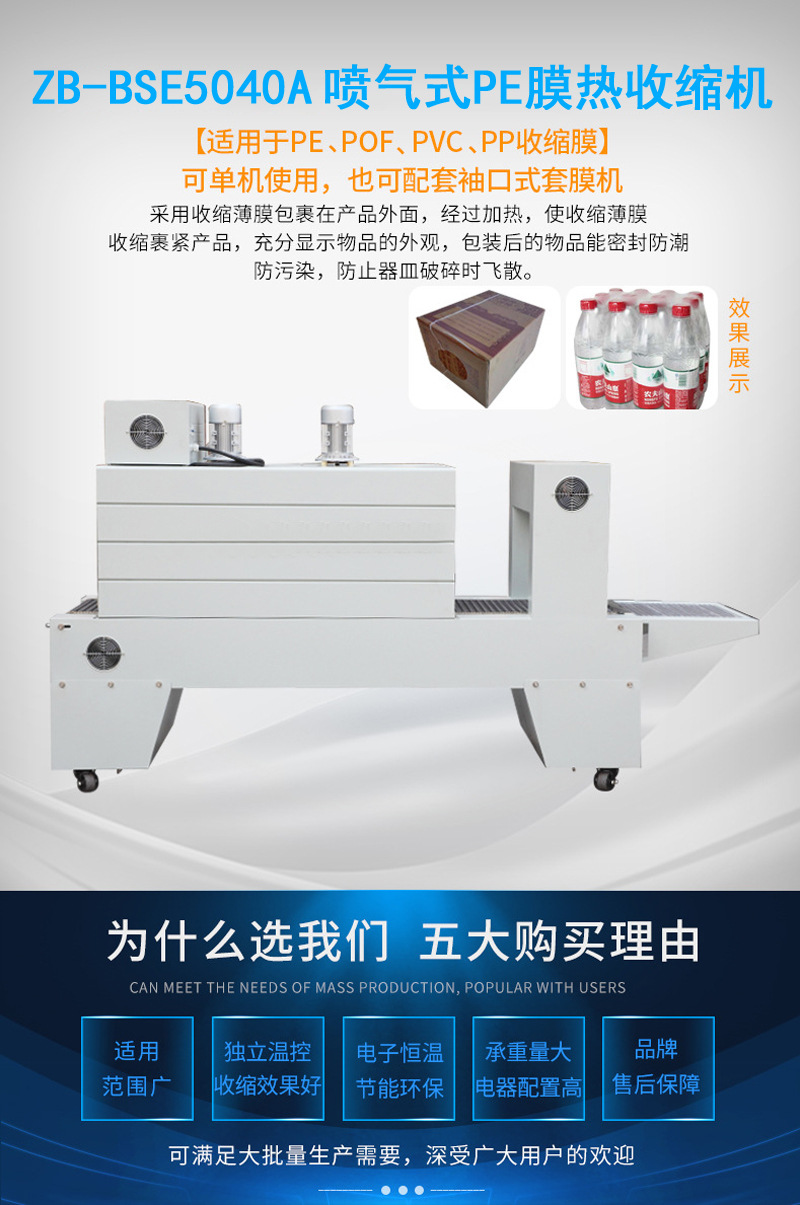 通過加熱裝置對套在產(chǎn)品外的 PE 膜進行加熱,使 PE 膜受熱收縮,從而緊緊貼合在產(chǎn)品表面,達到密封、防潮、保護產(chǎn)品及提升美觀度的效果 。