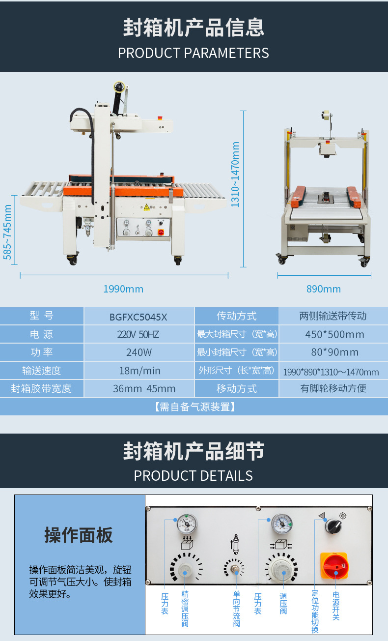 - 封箱尺寸:不同型號的封箱機封箱尺寸范圍不同,最大封箱尺寸可達到 500mm×600mm,最小封箱尺寸可至 140mm×150mm 1 。