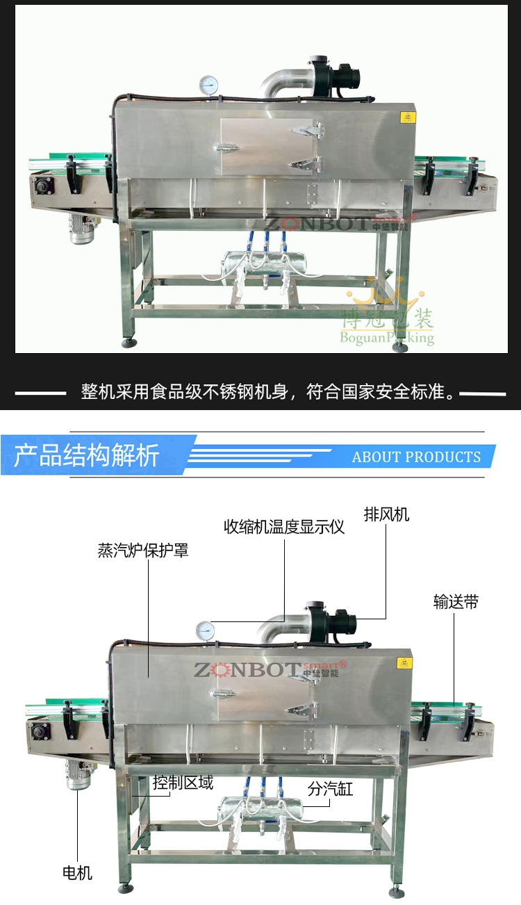 - 蒸汽收縮機:適用于對包裝溫度要求嚴格、對衛生要求較高的食品、藥品等行業,以及大桶或小瓶裝礦泉水、純凈水、汽水、茶飲料等包裝24。