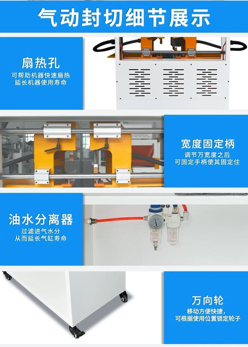 進入封口階段,設備憑借強大的氣動系統,以極高的壓力和精準的溫度控制,在極短時間內實現包裝材料的牢固封口。封口效果不僅平整美觀,而且具備出色的密封性,有效防止產品在后續運輸和儲存過程中出現泄漏等問題。緊接著,切角裝置在智能程序的控制下,依據預設的角度和尺寸參數,快速且精準地對包裝邊角進行切割,切角邊緣整齊光滑,一致性極高,極大提升了產品包裝的整體美觀度。