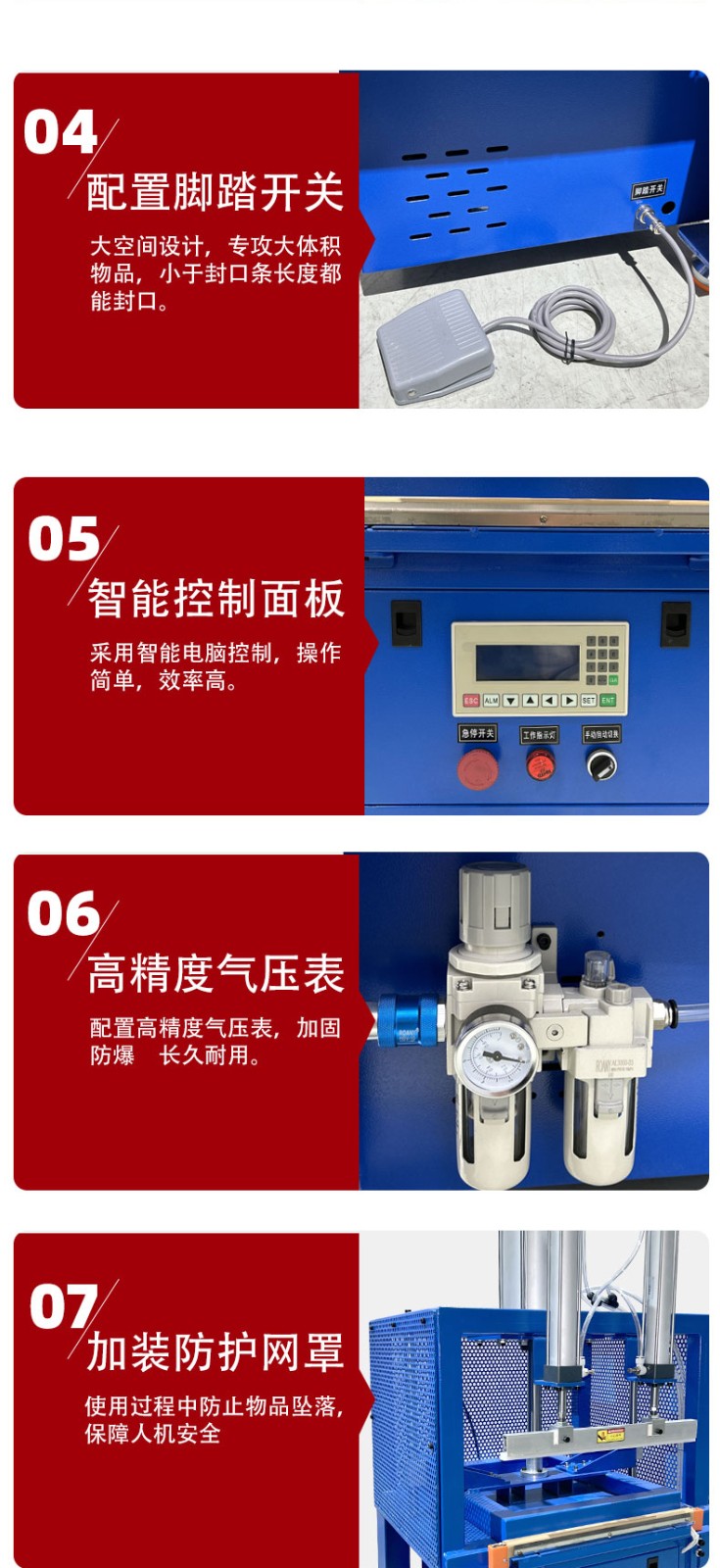 • 操作規范:操作人員嚴格按照操作規程使用設備,如正確設置加熱溫度、封口時間、壓縮壓力等參數,避免因參數設置不當導致設備過載、過熱等損壞。例如,長時間超溫使用會使加熱管過早老化。
