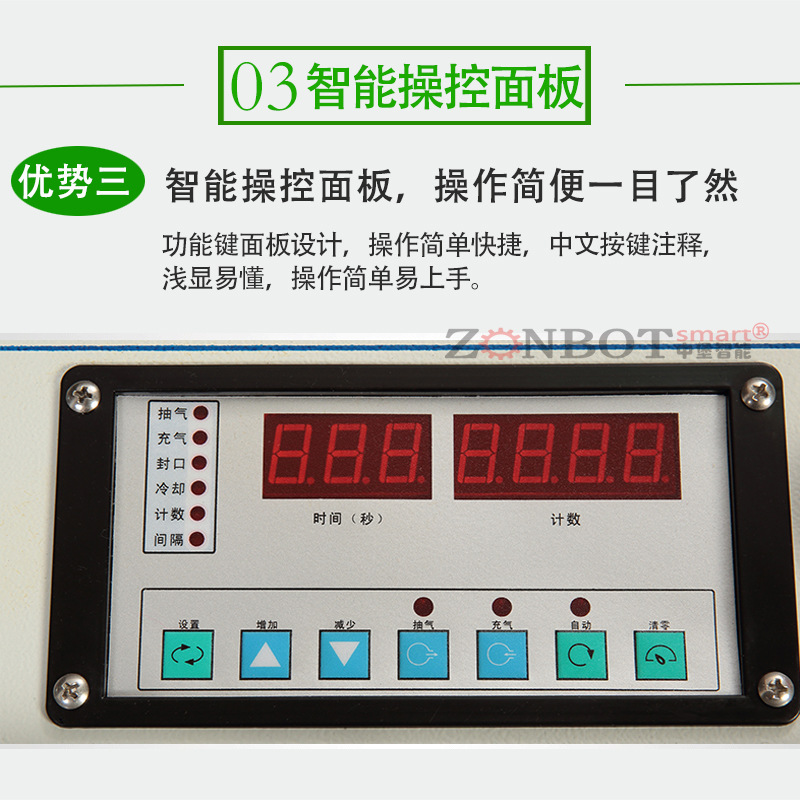 3. 對控制面板參數進行調試,根據真空物品來調試真空時間、封口溫度、冷卻時間。