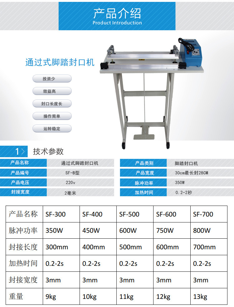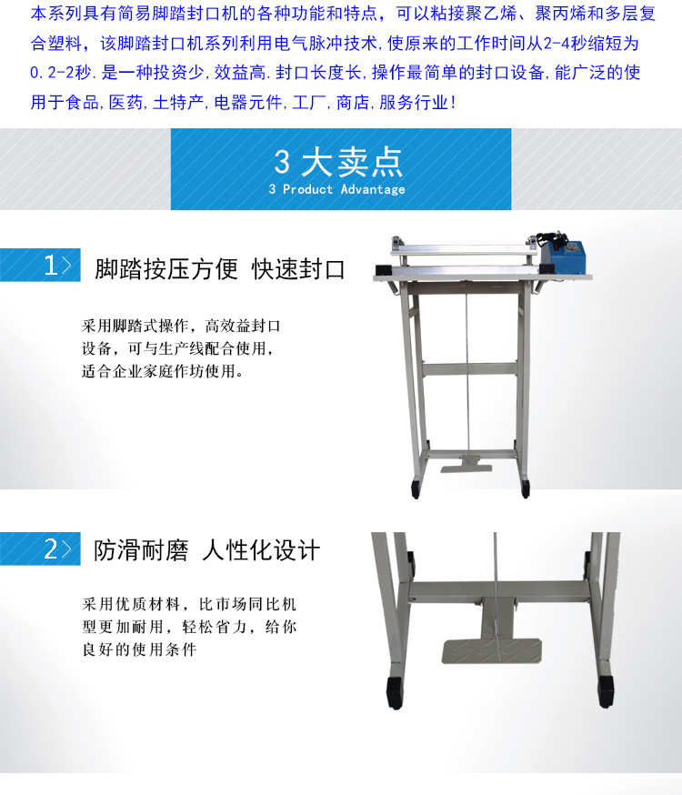 腳踏封口機適用于POF膜、包裝袋、收 縮膜、餐具袋。也可用作封切機(只要通過更換封切電熱絲即可). 結構簡單,操作方便,價格低廉