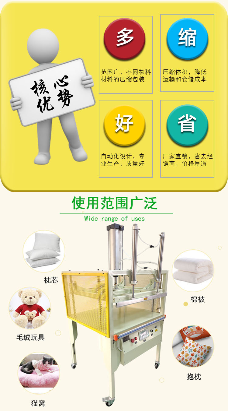 壓縮包裝機是用以壓縮包裝羽絨被服,太空棉被服、枕頭、靠墊、服裝、海綿