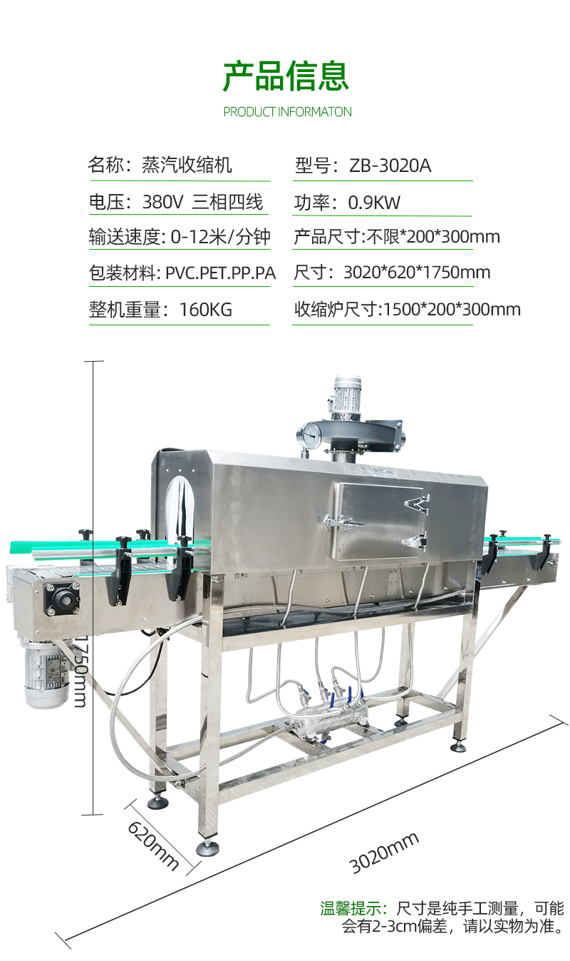 蒸汽收縮機因其高效、?穩定的特點,?被廣泛應用于多個行業。?在醫藥行業中,?蒸汽收縮機用于包裝藥品,?確保藥品的安全性和衛生性。?對于日用品,?蒸汽收縮機能夠提供高質量的包裝,?保護產品免受外界環境的影響。?食品飲料行業也廣泛使用蒸汽收縮機,?以確保食品的安全密封和保鮮。?此外,?家用化學品行業也依賴蒸汽收縮機來包裝各種家用化學品,?保證產品的質量和安全性。?