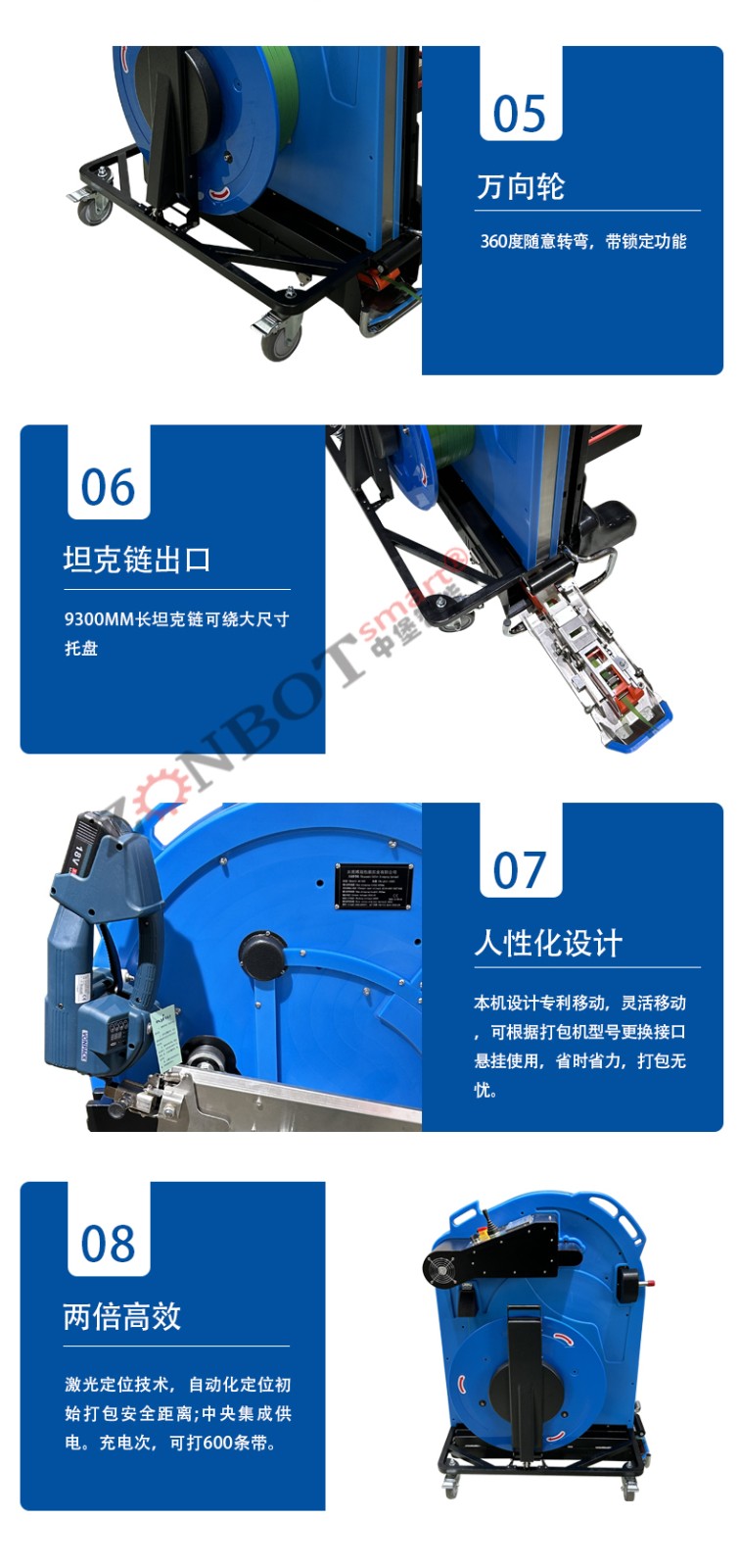 • 導向系統(tǒng):由多個導向輪和導軌組成。導向輪一般是可以靈活轉(zhuǎn)動的滾輪,它們可以根據(jù)打包帶的寬度和穿帶路徑進行調(diào)整。導軌則是為打包帶提供了一個固定的通道,確保打包帶沿著預定的路線行進。比如,當打包帶需要轉(zhuǎn)彎時,導向輪會將其引導到合適的軌道上。