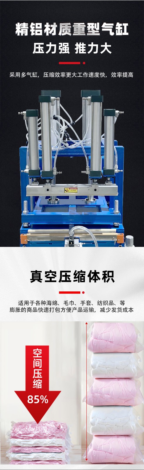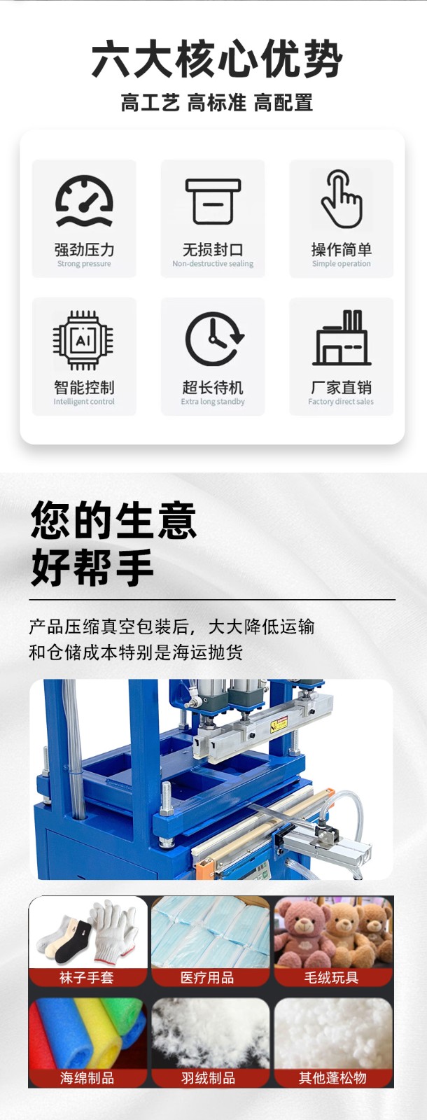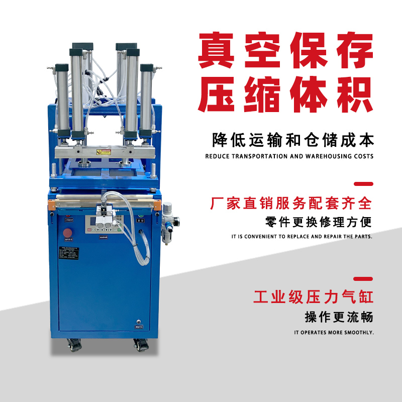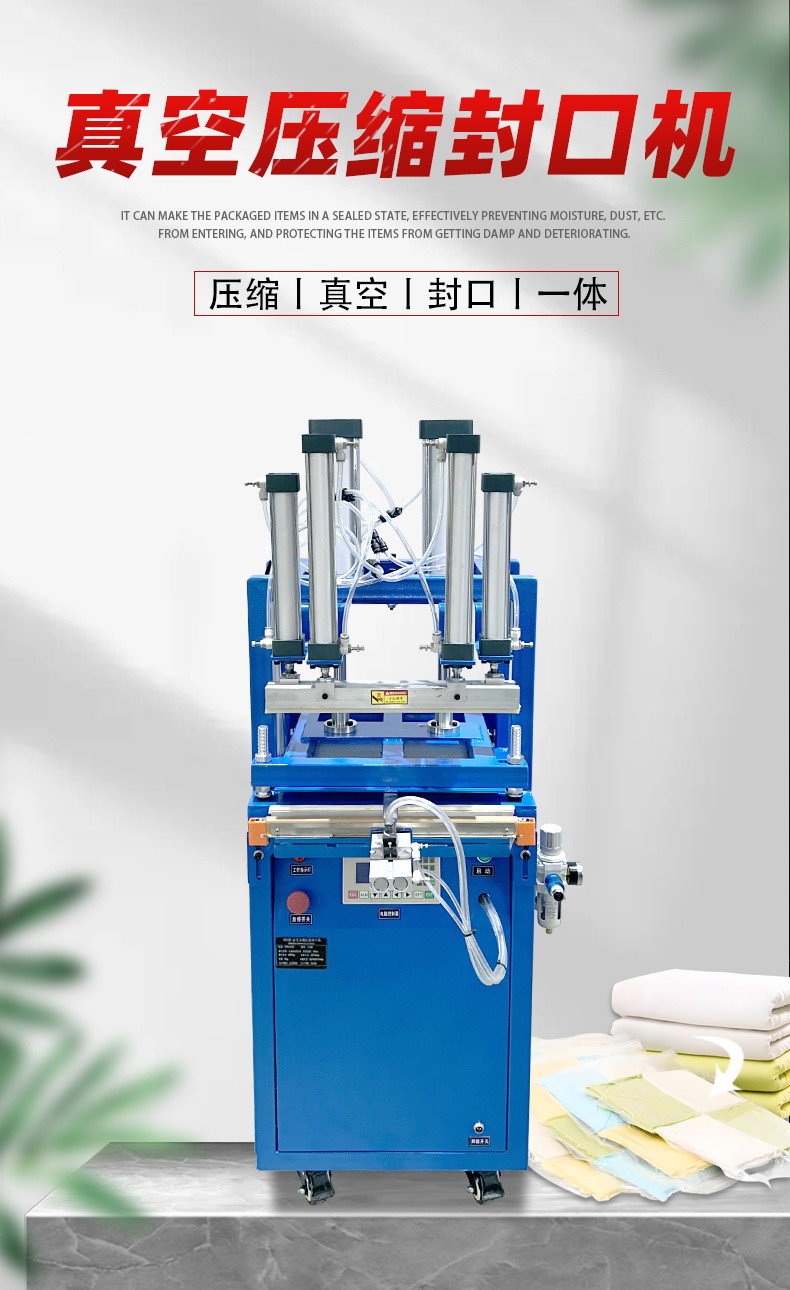 工作原理 抽氣:通過氣嘴或類似裝置,利用真空泵對包裝袋內(nèi)的空氣進行抽真空作業(yè),隨著包裝內(nèi)及被包裝物中的空氣被抽出,包裝袋體積減小,從而達到壓縮包裝物體積的目的。 封口:在抽氣完成后,通過封口作業(yè)將包裝袋口封牢,防止空氣回流,出現(xiàn)漲袋的問題。 壓縮:部分機型還會采用氣缸壓縮產(chǎn)品的方式,將包裝袋內(nèi)的空氣進一步排出去,使得包裝袋內(nèi)部形成 “偽真空狀態(tài)”,從而裹緊產(chǎn)品或包裝件。 性能特點 縮小包裝空間:能極大地縮小蓬松物品的包裝體積,降低儲藏運輸成本。 延長產(chǎn)品保質期:包裝后的物品能達到密封、防潮、防污染等功能,