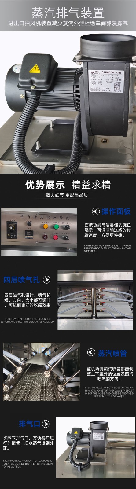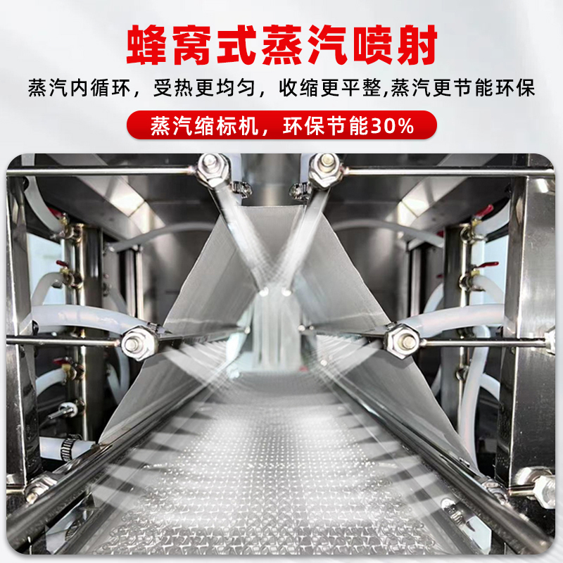 - 智能控溫,適配多類膜材配備 PLC 智能控制系統(tǒng),可精準調(diào)節(jié)蒸汽溫度(50℃-120℃可調(diào))、輸送速度與蒸汽噴射量,兼容 POF、PVC、PE 等多種熱收縮膜材,滿足不同產(chǎn)品的包裝厚度與質(zhì)感要求。